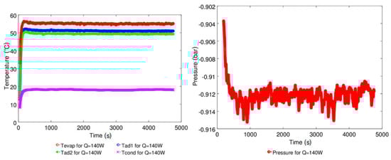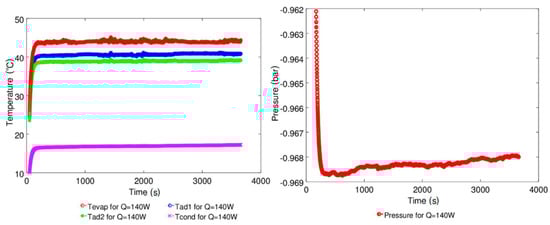 Working parameter variation as a function of time for a TPCT filled with distillate water at a filling ratio of 0.51 and heat load of 140 W: (left) temperature profile; (right) Gauge pressure profile.