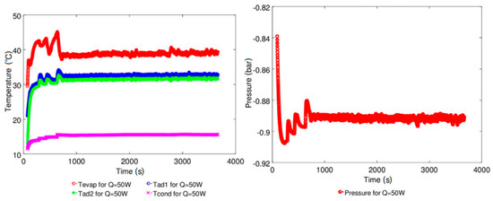 Working parameter variation as a function of time for a TPCT filled with SES36 at a filling ratio of 1.0 and heat load of 50 W: (left) temperature profile; (right) Gauge pressure profile.