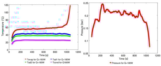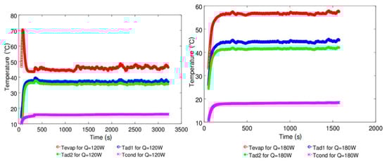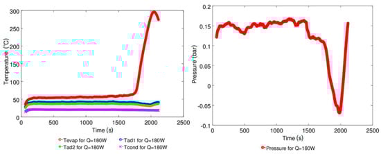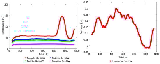 Working parameter variation as a function of time for a TPCT filled with ethanol at a filling ratio of 0.32: (left) temperature profile for heat input equal to 120 W; (right) temperature profile for heat input equal to 180 W.