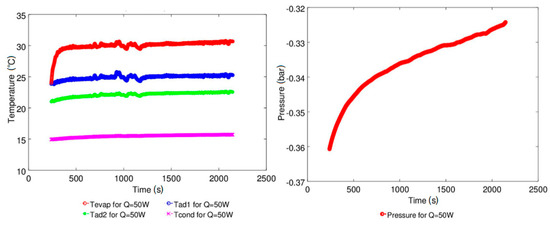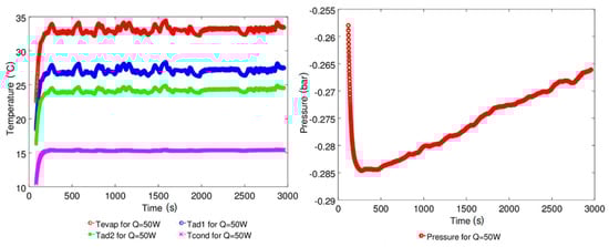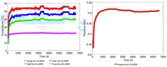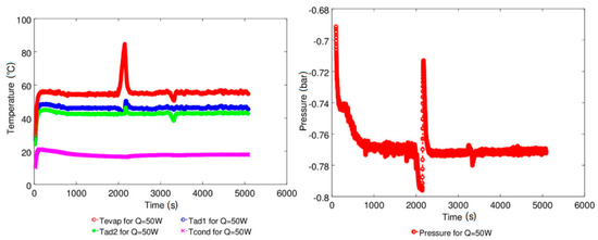 Working parameter variation as a function of time for a TPCT filled with ethanol at a filling ratio of 0.32 and heat load of 50 W: (left) temperature profile; (right) Gauge pressure profile.