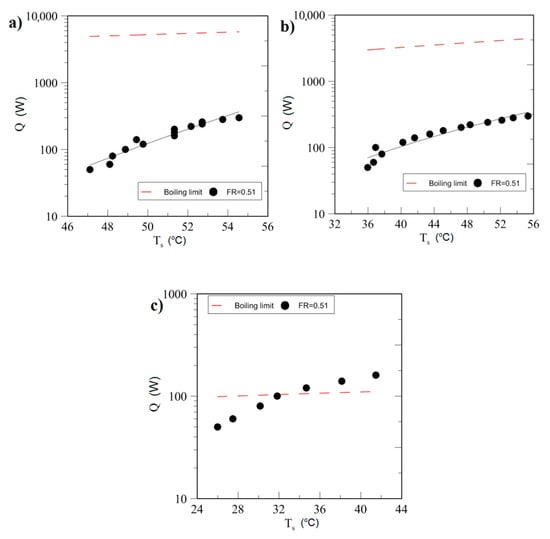 Boiling limits for a TPCT with a length of 1.2 m, inner diameter of 10 mm, and evaporator, adiabatic, and condenser section lengths equal to 400 mm: (a) water, (b) ethanol, and (c) SES 36.