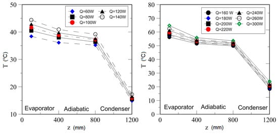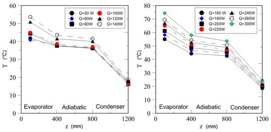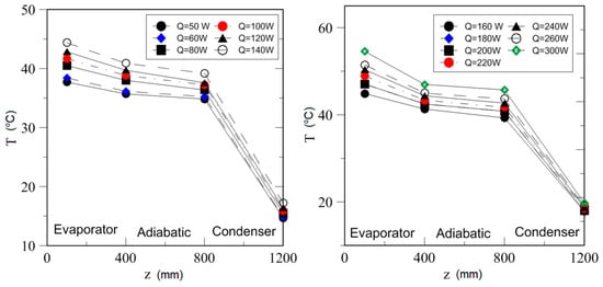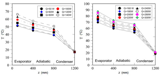 Temperature axial profiles for various heat power inputs for a TPCT working with ethanol at a filling ratio of 1.0: (left) for heat power inputs 50 W to 140 W; (right) for heat power inputs 160 W to 300 W.