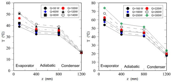 Temperature axial profiles for various heat power inputs for a TPCT working with ethanol at a filling ratio of 0.51: (left) for heat power inputs 50 W to 140 W; (right) for heat power inputs 160 W to 300 W.