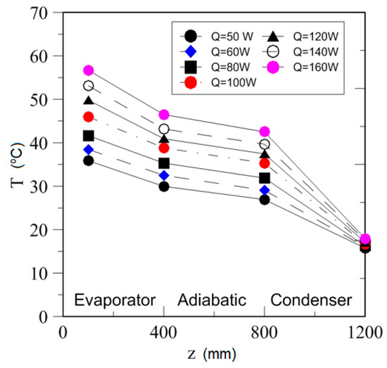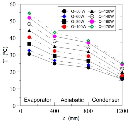 It is well known from the open literature [30,31] that the precise determination of TPCT performance demands precise temperature profiles along the thermosyphon. This is especially for the evaporator and condenser sections. As can be seen in Figure 22, Figure 23, Figure 24, Figure 25, Figure 26, Figure 27, Figure 28 and Figure 29, in the working fluid temperatures in condenser section was constant and did not depend on the variable heat input. In the case of the thermosyphon filled with water, a small negative slope of temperature between evaporator and adiabatic sections was observed. However, the difference was larger for higher heat inputs. This fact could be explained due to the existence (in this case) of a continuous liquid film that covered the internal wall surface in the evaporator section and also by the character of the heat transfer mechanism in the evaporation section. Heat was transferred by convection, and for low power input, the liquid level in the evaporator was generally high. As the heat input increased, the height of the liquid phase in the evaporator dropped, which resulted in the rise in the active heat transfer area of the evaporation section. A thin liquid film formed in the evaporation section, which enhanced heat transfer [32,33]. For a high heat input, the temperature in the evaporator section was relatively high. If the heat power was too high, it could initiate a transition from nucleation boiling regime to a film boiling regime. This caused the disintegration of the liquid film, which resulted in a rapid decrease of heat transfer in the thermosyphon. This could significantly increase the wall temperature in the evaporation section [34]. It should be emphasized that the negative slope of temperature between the evaporator and adiabatic sections was significantly larger for SES36 and ethanol compared to water. However, for a thermosyphon filled with SES36, a significant increase of evaporator wall temperature was also observed for rising heat power.