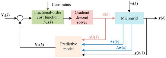 For an islanded microgrid, Figure 2 represents a schematic diagram of FOMPC-based optimal frequency control method. More specifically, by introducing the GL definition of fractional order calculus [] into Equation (16), a fractional-order integral cost function JFO(k) is approximated by Equations (18)–(21). The detailed derivation process from Formulation (16) to Formulation (18) can be found in Reference [].