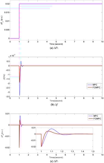 In case 1, we consider the condition of normal system parameters of an islanded microgrid and ∆PL = 0.02 p.u. after 1 s. Figure 4 presents the comparative results of frequency deviation ∆f, and power deviation ∆Pe obtained by FOMPC and MPC for an islanded microgrid under case 1. Obviously, the transient-state and steady-state responses of ∆f and ∆Pe obtained by FOMPC are better than those by MPC []. The performance of FOMPC and MPC methods is evaluated by the indices including the integral of absolute value of the error (IAE) for ∆f and ∆Pe denoted as IAE1 and IAE2, respectively, the overshoot of ∆f and ∆Pe denoted as Mp1 and Mp2, respectively, the rising time of ∆f and ∆Pe denoted as tu1 and tu2, respectively, the settling time of ∆f and ∆Pe denoted as ts1 and ts2, respectively, and the steady-state error of ∆f and ∆Pe denoted as Ess1 and Ess2, respectively. The IAE1 and IAE2 are defined as follows:
