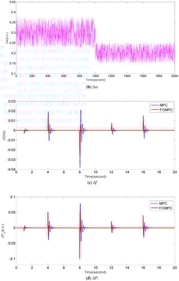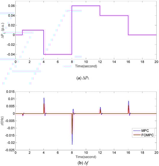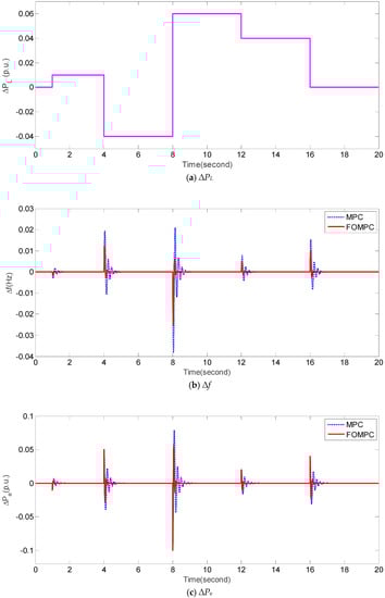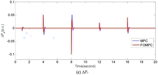 In order to test the robustness of FOMPC and MPC against perturbed system parameters and dynamical ∆PL, we design an experiment under the following condition: Tt = 0.6 (increase 50%), R = 1.5 (decrease 50%), H = 0.0833 (decrease 50%), and dynamical fluctuations of ∆PL (e.g., Figure 7a). Figure 7b,c present the responses of ∆f and ∆Pe by FOMPC and MPC, respectively. It is apparent that the responses of ∆f and ∆Pe obtained by FOMPC are better than those by MPC because of its more smooth flucutations and faster stabilization. Furthermore, the corresponding comparison of IAE1, IAE2, ITAE1, ITAE2, ISE1, ISE2, ITSE1, and ITSE2 is shown in Table 7. It is obvious that the proposed FOMPC method is superior to the traditional MPC [] under case 4.