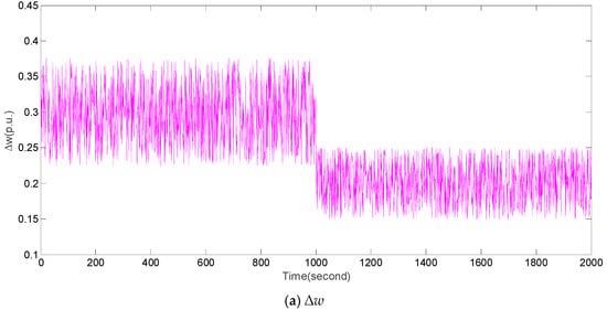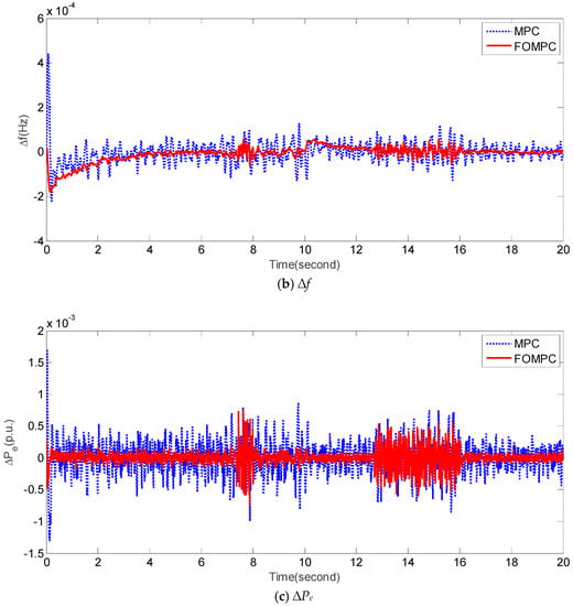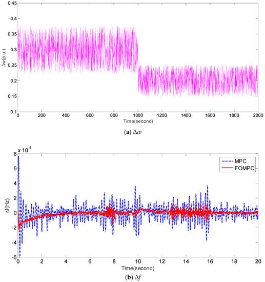 In case 3, we designed an experiment under normal system parameters and random dynamical fluctuations of Δw shown in Figure 6a. It should be noted that the random dynamical fluctuations of Δw are modeled based on Reference []. Figure 6b,c compares ∆f and ∆Pe of FOMPC and MPC, respectively. Intuitively, the fluctuations of ∆f and ∆Pe obtained by FOMPC are also less than those by MPC []. From a quantitative perspective, Table 6 compares the performance indices, such as IAE1, IAE2, ITAE1, ITAE2, ISE1, ISE2, ITSE1 and ITSE2 obtained by FOMPC and MPC. It is evident that FOMPC outperforms MPC under case 3.