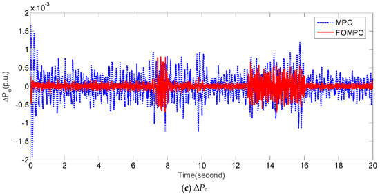 For case 2, the dynamical fluctuations of ∆PL (e.g., Figure 5a) and normal system parameters are considered. Figure 5b,c compare ∆f and ∆Pe obtained by FOMPC and MPC for an islanded microgrid, respectively. From the perspective of quantitative comparison, the control performance of ∆f and ∆Pe obtained by FOMPC and MPC is evaluated by the indices including IAE1, IAE2, ITAE1, ITAE2, ISE1, ISE2, ITSE1, and ITSE2. To be more specific, the ITAE1, ITAE2, ISE1, ISE2, ITSE1, and ITSE2 are defined as follows: