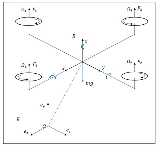 The dynamics of the quadcopter UAV using Euler-Lagrange equations is described by Main and Daobo [20]. Figure 1 shows the torques and forces acting on the quadcopter. Assume that the dynamics of the quadcopter are considered in body-fixed coordinate B and earth-fixed coordinate E. The front and rear (1 and 3) motors rotate in a counter-clockwise direction; the other motors (2 and 4) rotate in a clockwise direction. The distance from the center to each rotor is denoted by .