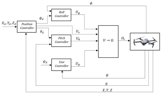 where and represents the torque and thrust force produced by the motor; are positive constants depending on the density of air, the radius of propeller, number of blades and geometry [11]; represents the rotational speed of the motor. is the total thrust; are the torques in the directions, which correspond to the roll, pitch, and yaw Euler angles, respectively.