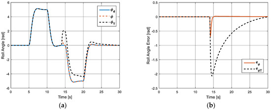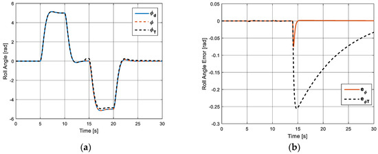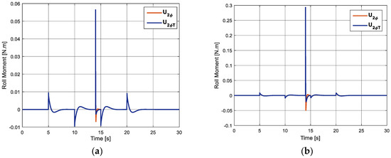 Figure 4 compares the tracking performance of the roll angle and error between the NASMC and MASMC methods, with 10% LoCE in actuator 2. From the initial time to 14 s, both methods can make a good tracking in roll angle and error with the same control input value shown in Figure 5a. In this stage, the control input is increased abruptly to change the roll angle from to at 5 s, and then it is decreased to change the roll angle from to at 10 s. After a small magnitude of fault is injected into actuator 2 at 14 s, the MASMC compensates quickly to track the desired roll angle. Furthermore, the MASMC demonstrates a quicker tracking error than the ASMC owning to it greater control effort when a fault occurs. From 15 s to 30 s, there is a similar trend in control effort for both NASMC and MASMC, which decreases the control effort at 15 s in order to change the roll angle from to , and then increases the control effort at 20 s to change roll angle from to . It should be noted that after fault occurs the MASMC can converge quickly to zero in tracking error. In all figures, and represent the desired roll angle, actual roll angle using MASMC, and the actual roll angle using NASMC, respectively. and represent the errors in roll angle using MASMC and NASMC. and are the moments of roll determined from MASMC and NASMC through Equation (2).
