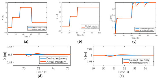 Tracking performance in three positions: (a) x-direction; (b) y-direction; (c) z-direction; (d) zoomed x-direction at 50 s; (e) zoomed y-direction at 70 s.