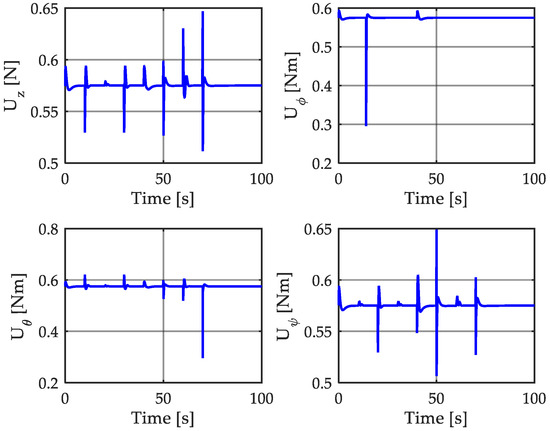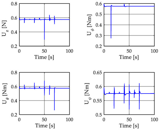 In this situation, 50% LoCE in actuator 1 and 3 is considered at 50 s, and 70 s, respectively. Figure 11 presents the tracking performance in three positions while Figure 12, Figure 13 and Figure 14 show the corresponding Euler angles , sliding surface, and control inputs . According these figures, when faults occur at 50 s and 70 s, the altitude is decreased at 50 s and 70 s due to loss of thrust force and then altitude can compensate steadily through the PID controller. The actual trajectories in directions can converge quickly to the desired ones in the presence of faults. It should be noted that although faults occur on the same axis of the quadcopter, the system still maintains the stability.