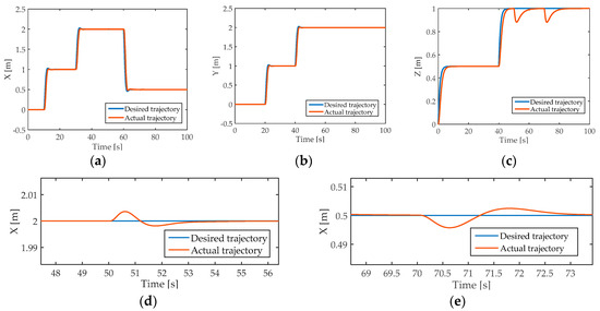 Tracking performance in three positions: (a) x-direction; (b) y-direction; (c) z-direction; (d) zoomed x-direction at 50 s; (e) zoomed x-direction at 70 s.