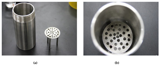 Details of the water-adding device. (a) The picture of a bracket and cylindrical vessel; (b) the bracket was placed into the cylindrical vessel for supporting the cores when adding water vapor.