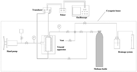 Two types of apparatus are used in this study. One is used to prepare hydrate samples, which includes a water-feeding device, a vacuum pump, a drying oven, a fridge, and a high-pressure reactor. The other is used to measure ultrasonic wave velocity, which includes a pulse sender/receiver machine (5077PR, made by Olympus NDT, Waltham, MA, USA.), a digital oscilloscope (TBS2012B, made by Tektronix Inc., Shanghai, China), two transducers, a core holder setup, a hand pump, and a cryogenic house. The water-feeding device contains a bracket to support core, under which is deionized water, as shown in Figure 1. The temperature range of the dry oven is 0–200 °C, which is used to dry the cores and supply heat for water vaporization. The high-pressure reactor where hydrates were formed is constructed from stainless steel, with an effective volume of 0.1 L (Φ40 × 80) and a maximum working pressure of 60 MPa. The experimental apparatus for measuring ultrasonic wave velocity is shown in Figure 2. The size of cryogenic house is 5 m × 2.5 m × 3 m, with working temperature of 248–323 K. The core holder setup was placed into the cryogenic house to maintain the system temperature, thus protecting methane hydrate from decomposing during acoustic test. The confining pressure was controlled by a hand pump manufactured by Jiangsu Haian petroleum research Ltd. (Haian, China). In addition, a Monitor and Control Generated System (MCGS) manufactured by Beijing Kunlun Coast Sensing Technology Co. Ltd. (Beijing, China) was used to monitor and record the temperature and pressure per minute.