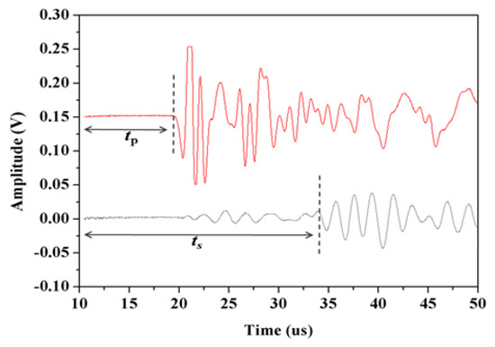 where L is the length of specimen, m; t is the travel time of P and S-wave, as shown in Figure 3; t0 is the travel time when two detectors tightly touched together, the value is 5.704 × 10−6 s.