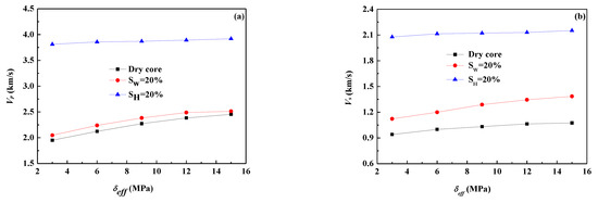 The most relevant physical properties for predicting the behavior of gas hydrate-bearing sediments are pore space occupants, effective stress, and lithologic characteristics of host sediments. The influence of pore occupants on the elastic properties was investigated by measuring the acoustic velocities of recovered cores with water saturation of 20%, hydrate saturation of 20%, and a completely dry core. As shown in Figure 4, both Vp and Vs of hydrate-containing cores are much higher than that of water-containing and dry cores, indicating that gas hydrate is the most important pore occupant that could significantly change the elastic properties of host sediments. Gas hydrate not only can occupy the pore space, but also works as an adhesive to cement surrounding rock particles, which would further strengthen the skeleton structure of sediments [10,12]. Hence, the increase of Vp and Vs are comprehensive results caused by the increase of hydrate concentration in the pore space.