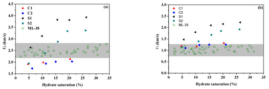 The P-wave velocity (a) and S-wave velocity (b) versus hydrate saturation at the effective confining pressure of 3 MPa, respectively. Clayey hydrate-bearing specimens (C1, C2), sandy hydrate-bearing specimens (S1, S2), and the field data of Mallik 2L-38 well in Northern Canada (circles and grey shading).