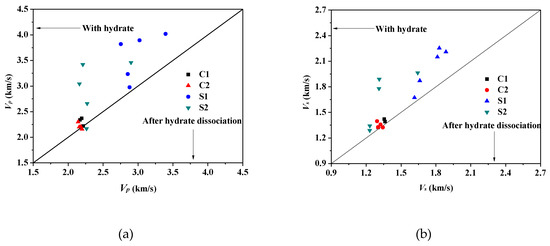 Comparison of the acoustic velocities of hydrate-bearing sediments before and after hydrate dissociation. (a) P-wave velocity, (b) S-wave velocity. Hydrate saturations are shown in Table 2.