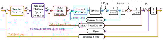 The structure of the RSS toolface control method is summarized in Figure 2, and it is also suitable for our DPRSS. The control method consists of four loops from inside to outside, namely, the current loop, the motor speed loop, the stabilized platform speed loop, and the toolface loop. The motor is described by the transfer function, where is the Laplace operator, and are the motor stator resistance and inductance, is the torque constant, is the coefficient of counter electromotive force, is the total inertia of the stabilized platform and the motor, and is the viscous coefficient. , and denote the toolface, motor speed, and motor current, respectively. The load torque is the disturbance of the motor speed loop, and the outer housing rotary speed is the disturbance of the stabilized platform speed loop. Both the current loop and motor speed loop are designed to improve motor performance. The stabilized platform speed loop is to suppress outer housing speed fluctuations, and the toolface loop is used to track the toolface reference.