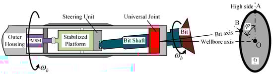 In Figure 3, plane Ῥ is perpendicular to the wellbore axis, point A is the top of plane Ῥ, and point B is the intersection of the bit axis and plane Ῥ. The line is named the high side; the angle between and is the toolface, and it is denoted by . The toolface is defined between 0 and 360 deg, which represents the intended drilling direction. The DPRSS consists of four fundamental parts: the outer housing, the stabilized platform, the bit shaft, and the universal joint. The outer housing connects to the drill string and rotates at the same speed as it. The drilling torque and the WOB are transmitted from outer housing to bit through the universal joint. The steering unit is assembled on the stabilized platform, and the bit shaft connects eccentrically to the steering unit.