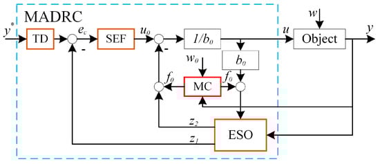 where , , , and are listed in the Appendix A, specifically. If is set to 0, the MADRC is equivalent to the CADRC. The block diagram shown in Figure 13 is derived to obtain the closed–loop transfer function.