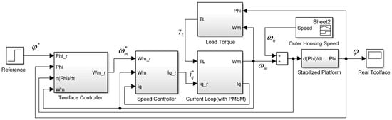 As shown in Figure 6, the control method was simulated by Simulink software. The current loop and PMSM were combined in one block. The speed loop control algorithm and the toolface loop control algorithm were performed by different blocks. The load torque disturbance was simulated as follows [11]:
