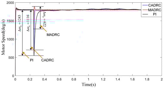 The motor speed loop was simulated firstly. The motor speed controller sampling time was 0.5 ms. The CADRC and a well–tuned PI controller were also employed for comparison, and the CADRC uses the parameters in Table 2.