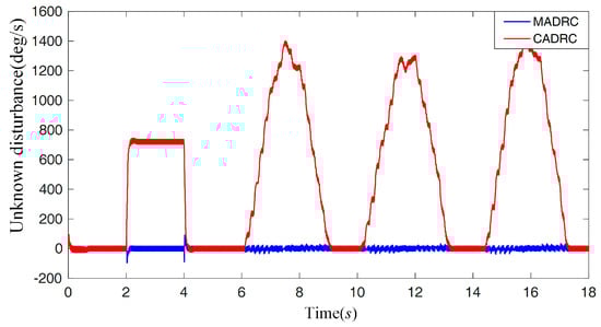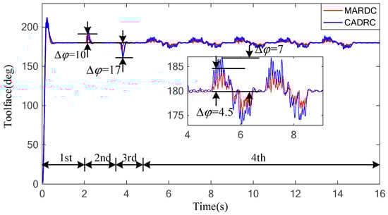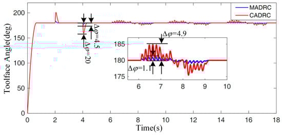 As can be seen in Figure 11. At t = 0 s, the 180 deg step reference is added, the CADRC and MADRC response curves are similar, but the MADRC shows better disturbance rejection performance at the beginning of the second part. In the following part, the negative step disturbance is added, the maximum toolface errors for CADRC and MADRC are 20 deg and 4.5 deg, respectively, and the MADRC reduces 77.5% tracking error of the CADRC. In the last part, sustained oscillations can be observed: the MADRC tracking error is 1.1 deg, but that of the CADRC is 4.9 deg. In Figure 12, the ESO estimated unknown disturbance of CADRC follows the outer housing speed variation, but the one of MADRC is nearly zero, which reveals the MADRC disturbance estimation burden was reduced, and the disturbance rejection performance was improved as desired.
