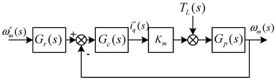 where , , and are listed in the Appendix A. Then, the closed–loop transfer function and the disturbance transfer function can be obtained. Note that the load torque disturbance is considered in the form of its motor speed response.