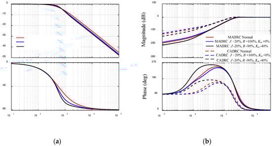 Frequency response of the speed–loop. (a) the frequency response of ; and (b) the frequency response of with parameter uncertainties.