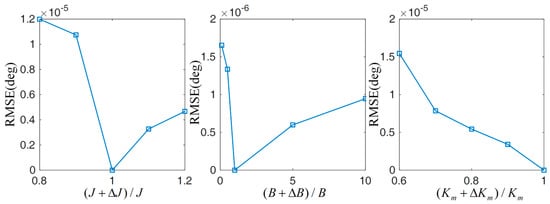 The DPRSS is operated in harsh drilling conditions, the parameter uncertainties in Equation (16) and the disturbance rejection performance in the presence of various disturbances need to be considered. Since the stabilized platform is sealed inside the outer housing, the total inertia is mainly affected by bit inertia variation, such as the bit balling, which increases the bit inertia, and the bit wear, which decrease the bit inertia. The friction factor is mainly affected by the bearing friction which is related to temperature and bearing load. The motor torque constant is reduced with the increasing of temperature. Considering bit wear [29], bit balling, bear friction variation and motor flux linkage variation [30], the error of , and was assumed to be ±20%, −90% to +100%, and −40% to 0%, respectively. Note that the controller parameters were the same during the simulation.