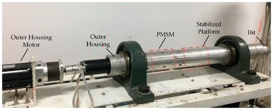 The DPRSS prototype is shown in Figure 18. The outer housing is connected to the outer housing motor by a spline coupling, and the outer housing motor acts as the upper drilling string which drives the outer housing. The stabilized platform which driven by the PMSM is assembled inside the outer housing. A sensor package, including a gyro, accelerometer, and microprocessor, is installed on the stabilized platform [32]. The proposed controllers are implemented in a TMS320F28335 DSP. The high-speed CAN bus is used for data exchange between the DSP, the microprocessor, and the USB-CAN analyzer. The analyzer acquires all data. The motor speed is measured by a resolver, and the toolface is measured in the way shown in [30].