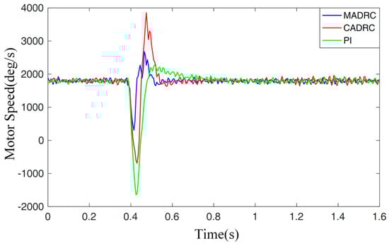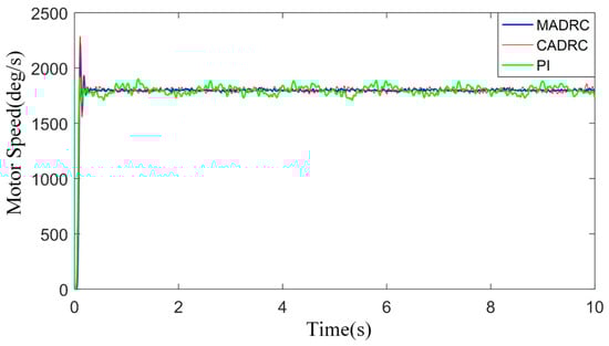 The motor speed responses of MADRC, CADRC, and PI are shown in Figure 7. It is observed that all three controllers can track the reference step change and reject the load torque disturbance. The MADRC and CADRC take 0.023 s to suppress the disturbance, but the PI controller needs 0.103 s. The maximum speed tracking errors in the presence of load torque disturbance for the MADRC, the CADRC, and the PI controller are 622 deg/s, 1116 deg/s, and 1243 deg/s, respectively. The results reveal that the MADRC is more effective, which shows the best reference tracking and disturbance rejection performance in the motor speed loop simulation.