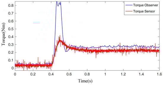 Owing to the torque motor limitation, only the constant 0.25 Nm load torque was tested. The load torque disturbance rejection performance is shown in Figure 21. The test results meet an agreement with the simulation in Figure 7, with the load torque being compensated in MADRC, its tracking error is the smallest among the three algorithms. Figure 22 shows the load torque observer output and the torque sensor measurements, the torque estimation error is larger than the one in the simulation, but it follows the real torque tendency as desired.