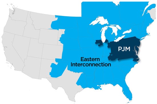 PJM service area. The dark blue area is the region. The light blue area is the Eastern Interconnection, which is electrically connected to PJM. The Regional Transmission Organization (RTO) is charged with balancing supply and demand over this region as well as managing imports and exports of electricity. source: https://www.pjm.com/.