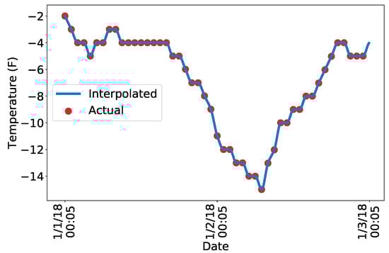 Before modeling, we must also ensure the time resolution of the different datasets is consistent. The temperature data used for this paper are hourly, while the load data are reported in five-minute increments. We deal with this by interpolating hourly data to five-minute data using a piecewise cubic Hermite interpolating polynomials, as described in [20]. The results of this interpolation for temperature data over a ten day period are provided in Figure 2. We use the Hermite spline for several reasons: an efficient implementation is available in most scientific programming languages; it is a true interpolating polynomial in that its output agrees with the observations, and it enforces first order smoothness and monotonicity between observations. These last two properties are realistic in that temperatures do not typically have discontinuities in their derivative and observations are sampled frequently enough that temperature can be assumed not to oscillate between consecutive observations.