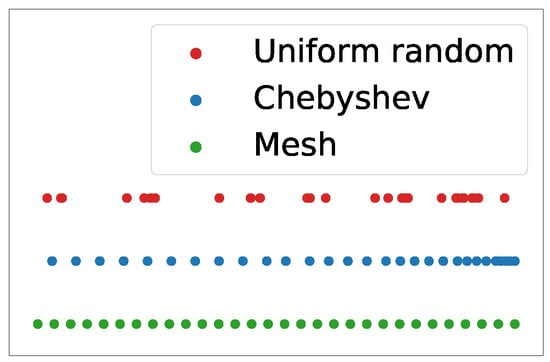 A known issue with Gaussian processes is that the computation time generally scales cubically with the number of observations. In the context of load forecasting, training on one month of 5-min ticks results in 8928 observations, which is about the limit of computational feasibility for a modern desktop computer. Substantial efforts have been made in the machine learning community to address the scalability problem [22,23,24,25], but discussion and implementation of the proposed algorithms are beyond the scope of this paper. A simpler approach, common in the numerical analysis community, is to sample at appropriate intervals. Empirical and theoretical research has shown that, for interpolation, errors tend to increase near the boundary of the domain and that the location of observations can have a dramatic effect on this error ([26] Section 14.3). We are extrapolating beyond the boundary of the domain so the theoretical results from approximation theory may not apply; nevertheless, it seems intuitive that a sampling scheme which works well on the boundary may be more effective than sampling observations uniformly at random. Thus, in accordance with wisdom from numerical analysis [26], we sample our training data more densely near the boundary of prediction, similar to the placement of Chebyshev nodes. The seminal paper by Hoel and Levine [27] shows that, for extrapolation based on polynomials, Chebyshev nodes provide the optimal spacing. Although our predictions are made with Gaussian processes rather than polynomials, the result of Hoel and Levine [27] along with the intuition that points near the boundary provide more relevant information suggest that Chebyshev nodes are an appropriate choice. Figure 3 provides a visualization of three different methods for sampling: the uniform random method samples observations from the training set uniformly at random, Chebyshev samples more observations near the prediction boundary, and mesh spacing samples observations on a coarse evenly spaced grid (e.g., every three observations).