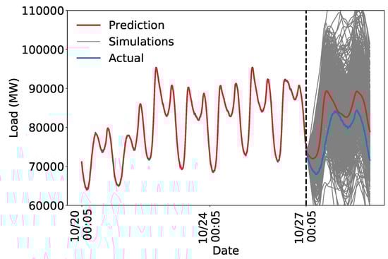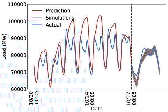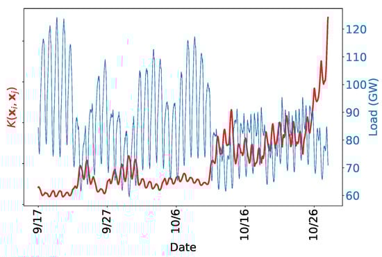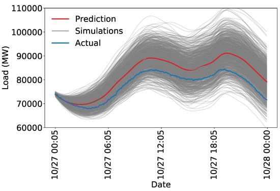 We train each model on PJMISO data beginning on 17 September 2018 and ending on 26 October 2018. We then predict load for 27 October 2018. The point estimate prediction is the posterior mean of the Gaussian process. We also draw 1000 samples from the posterior distribution to illustrate the uncertainty of the model. Parameters that are not set manually are estimated via maximum likelihood, as described in Section 2.5. The parameter is not associated with any kernel, but reflects the magnitude of the noise, and is required for regularizing the kernel, as shown in Equations (1) and (3).