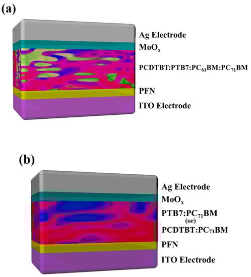 We performed FDTD simulations using Lumerical FDTD solutions software. The solar cell structures are shown in Figure 1. The complex refractive indices were provided for the individual layer materials of the photovoltaic structures. The thickness of each layer was as follows: Indium tin oxide (ITO) = 150 nm, Poly [(9,9-bis(3′-(N,N-dimethylamino)propyl)-2,7-fluorene)-alt-2,7-(9,9–dioctylfluorene)] (PFN) = 7.7 nm, Molybdenum oxide (MoOx) = 10 nm, and Ag = 150 nm. The MoOx acts as a hole transport layer, while the PFN operates as an electron transport layer. A frequency-domain field and power monitor were used to obtain the electric field intensity distribution inside the device structure. A plane wave source was used as the illumination source and was incident at 90°. Periodic boundary conditions were used perpendicular to the source incidence axis and perfectly matched layers were used along the incidence plane. Multi-coefficient fitting of the complex refractive indices and meshing of the device structure were utilized as necessary. The quaternary BHJ ratio was set at 1:9:3:12 of PCDTBT:PTB7:PC61BM:PC71BM, as seen in the reference article by Nam et al. [17]. For the single bulk heterojunction photovoltaic structure we utilized PTB7:PC71BM and PCDTBT:PC71BM-based device structures. The active layer thickness was varied from 50 to 400 nm and the corresponding electric field intensity inside the active layer was used to measure the number of photons absorbed. By assuming 100% internal quantum efficiency (IQE), the ideal short-circuit current density (Jsc,ideal) of the photovoltaic cell was obtained. The absorption of the active layer was simulated using the Pabs monitor in the software. As this was an optical simulation, the changes to the open circuit voltage (Voc) and fill factor (FF) due to variation in the active layer thickness were assumed to be negligible when compared to the short-circuit current density.