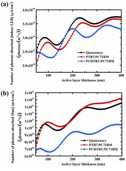 Assuming 100% IQE, the ideal short-circuit current density (Jsc,ideal) was simulated. (a) The number of photons absorbed (which directly relates to the Jsc,ideal) in quaternary and single BHJ photovoltaic cells under indoor LED illumination. (b) The number of photons absorbed in quaternary and single BHJ photovoltaic cells under AM1.5 G illumination.
