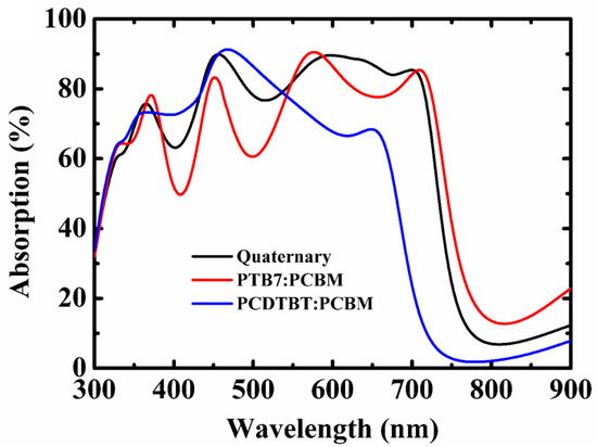 The absorption of quaternary and single BHJ active layers at a thickness of 230 nm. The single BHJs showed absorption similar to the quaternary indoor photovoltaic (IPV), with the quaternary IPV exhibiting a slightly higher absorption than PTB7:PC71BM, and a slightly lower absorption than PCDTBT:PC71BM at ~450 nm wavelength (LED spectrum’s peak).