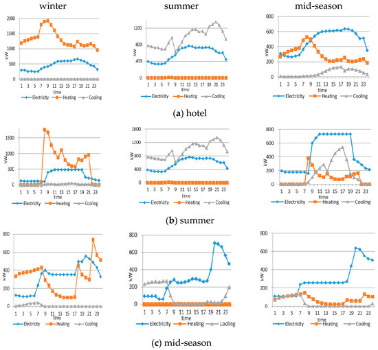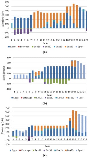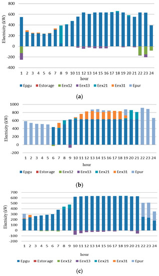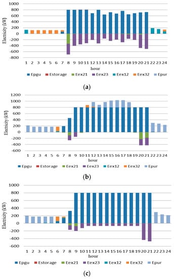 It is necessary to analyze the hourly electricity interchange between each building connected by network in the three typical days. According to Figure 5, on a winter day, the electricity produced by the DES can satisfy all electricity requirements of the office, and most of the excess electricity is transferred through the electricity network from office to residential building (Eex23) to cover their electricity loads. Meanwhile, partial excess electricity of the hotel is also transferred to residential buildings (Eex13). This is mainly due to the higher electricity-grid price for offices and hotels in the daytime and the PGU produce much electricity, which is higher than the electrical demand to avoid purchasing electricity from grid. Hence, the surplus of produced electrical energy is injected into other building power lines. While during night time, the phenomenon is reversed, so that the hotel and office receives electricity from residential buildings (Eex31 and Eex32). Especially in an office, no CCHP unit is on and the electricity demands are all satisfied from the electricity transferred from residential buildings through the power network. On a summer day, the PGU allocated in the three buildings operates at full load in accordance with the higher electricity demand from 9 a.m. to 9 p.m. This is because the cooling demand in peak hours is so high that the recovered thermal energy is not enough for cooling, thus the electrical chiller is also used to cover the deficiency. In the hotel, the deficiency of electricity is also transferred from the residential building during the daytime (Eex31), while on a mid-season day, the electricity demand of residential buildings is satisfied by hotel and office during the daytime due to its lower requirements (Eex23 and Eex13).