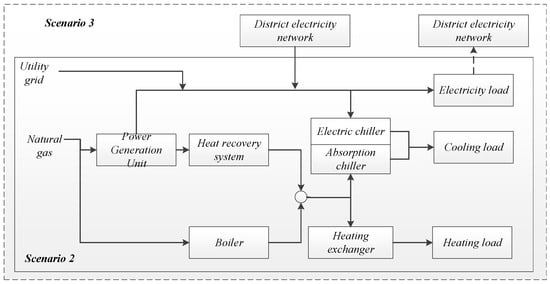 Figure 2. The superstructure of distributed energy system (scenario 2) and system integrated with electricity network (scenario 3).