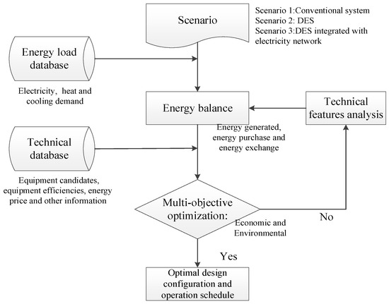 The problem proposed in Section 2 was constructed as a MILP model. The typical daily load curves of hotels, offices and residential buildings were chosen as the study case to verify the feasibility of the presented methodology. The model contains a multi-objective function, technology design constraints and energy balance constraints. The conventional system in scenario 1 was introduced as the basis to evaluate the performance of the DES. The basic structure of this analysis is shown in Figure 3.