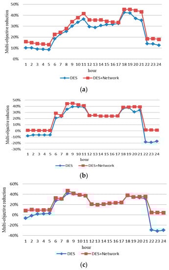 The adoption of the DES+ Electricity Network scenarios allowed for the higher objective reduction values. The application of the DES technologies in scenario 2 as well as in scenario 3 with the installation of the power network, led to a average 20–30% and 30–40% reduction compared to the conventional system respectively.