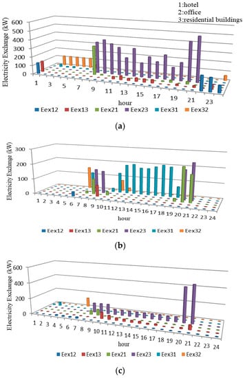Each building, in which a PGU is installed, can be regarded as an energy producer since a certain amount of electricity is transferred to other buildings. Therefore, it is also important to investigate the electricity interchange between each building through the distribution grid. The hourly optimal interchange between the three typical buildings in scenario 3 is presented in Figure 5. It reflects the cooperative relationship of end-users within the electricity network. For example, the value of Eex12 implies the electricity supply from hotel to office, whereas the Eex21 is the deficit part that is from office to hotel.