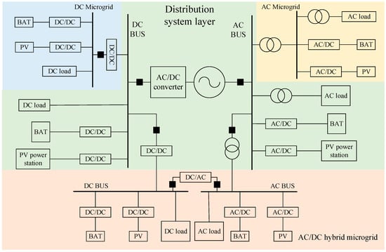 As shown in Figure 1, AC and DC distribution networks are interconnected by AC/DC converters. Under this structure, large-scale and centralized distributed generators are connected to AC or DC distribution network systems through converters, which reduces the use of converters and improves the access capacity and generation efficiency of distributed generators [9,10,11]. The microgrid in the system can exist in many forms, mainly depending on the type of load and load demand. For pure AC or DC load systems, AC or DC microgrids can be established to supply power. If AC and DC loads need a power supply at the same time and the load cannot be transferred, it is the most economical choice to construct an AC/DC hybrid microgrid, which can effectively reduce system costs and losses and improve the power supply capacity of the system.